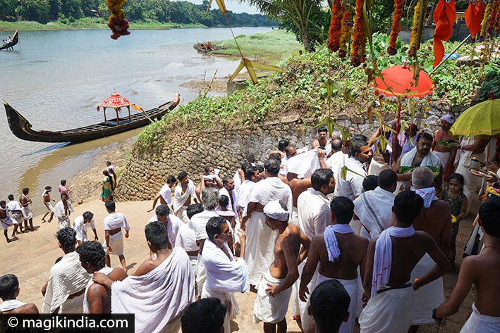 Several “snake boats” or chundan vallams accompanied the procession across the River Pampa. The idol was installed in the temple on the day of Uthrattathi in the month of Chingam (August-September) according to the Malayalam calendar, Uthrattathi being Arjuna’s birthday. The village of Aranmula celebrates this event each year with a snake-boat regatta during the Onam festival.
