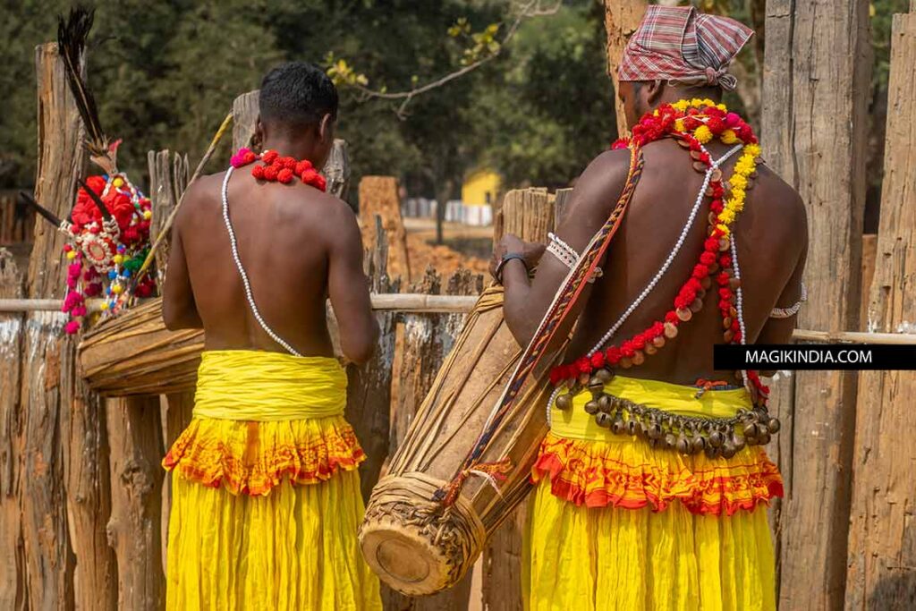 Among the other choreographic traditions of the Muria, the Gedi dance (performed on stilts) stands out due to its utilitarian origins and athletic character. Initially designed to traverse flooded areas and avoid the dangers of the monsoon, the wooden stilts have evolved into the instrument of a complex ritual dance dedicated to the harvest.