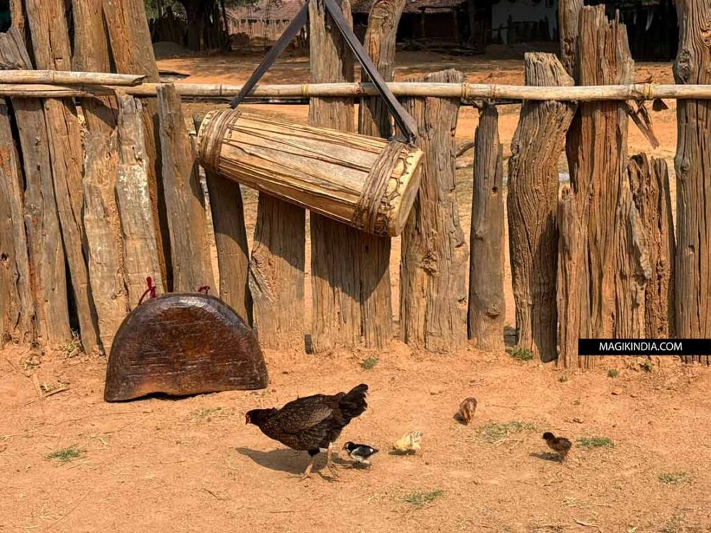 Erected in the center or at the edge of the Muria village, the ghotul serves as the central hub of social life. This rectangular building is distinguished by a massive timber framework, crafted from Sal or teak wood, supporting an imposing roof of handmade tiles.