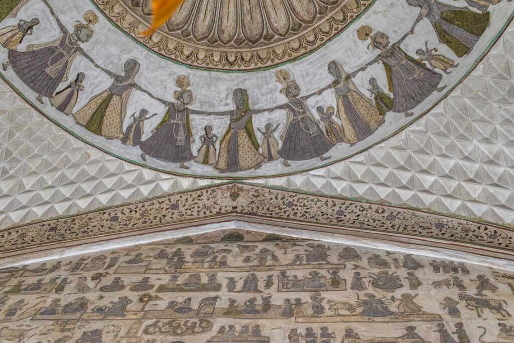 L’antichambre est un chef-d’œuvre de raffinement : des fresques de Shiva et Parvati, ainsi que de Sri Krishna et Radha, ornent les murs latéraux. Le plafond, quant à lui, est orné d’une fresque magistrale dépeignant la « Raas Lila », la danse mystique et extatique de Krishna et des gopis, qui symbolise l’union de l’âme individuelle avec le divin. Cette scène est rehaussée par la présence d’anges célestes qui la survolent, illustrant encore une fois le syncrétisme artistique caractéristique des havelis du Shekhawati.