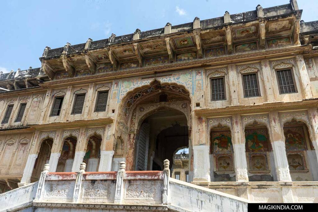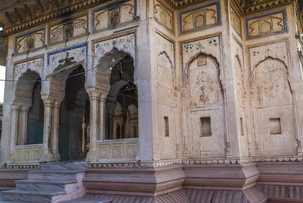 Situé au coeur de la vieille ville, le temple de Bihariji se présente comme un remarquable témoin de l’art du Shekhawati, ayant été érigé en 1776 (Samvat 1833) par l’influent mécène local, Seth Malalidatt Shah de Khetri. Dommage que l’attrait du temple soit nuancé par l’accueil peu chaleureux du nouveau pujari (prêtre) !