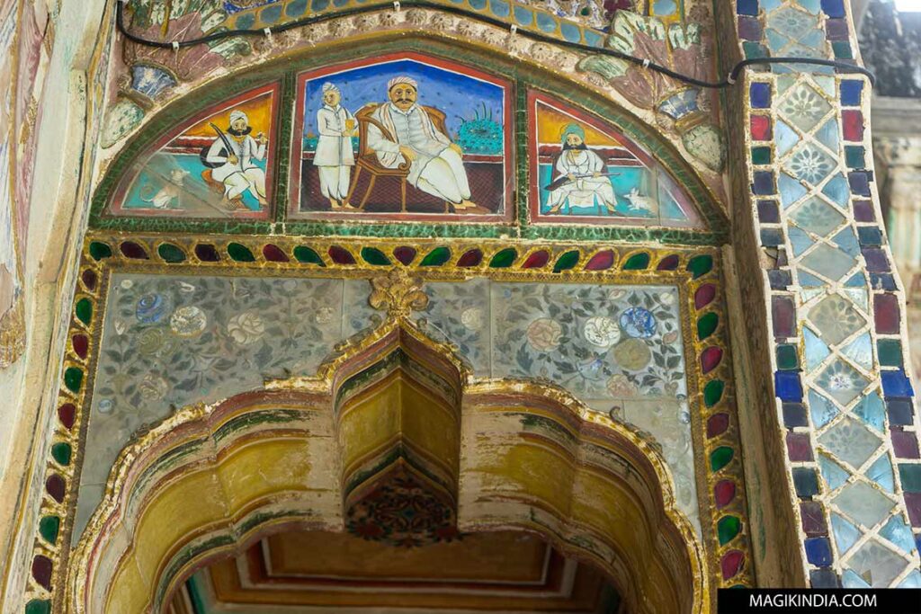 Parmi ces demeures, l’Haveli de Modi & Tibrewal se distingue particulièrement. Située au cœur du bazar principal, elle constitue en réalité une paire de résidences se faisant face, dont les fondations dateraient de la fin du 16e siècle.