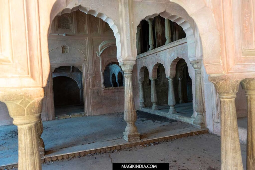 Ses grandes salles sont soutenues par des arches élégantes de style rajpoute, et de nombreuses pièces communiquent entre elles par des portails voûtés plutôt que des portes, créant un environnement naturellement ventilé. La Ketri Mahal est d’ailleurs considéré comme le modèle qui a inspiré la construction du célèbre Hawa Mahal (palais des vents) de Jaipur, bâti quelques années plus tard.