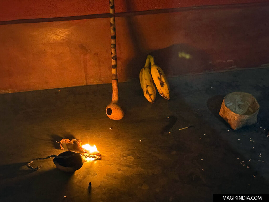 Lors des rituels, le passage entre les mondes s’opère dans une mise en scène saisissante : assise devant un Idital, la chamane récite des mantras rythmés jusqu’à sombrer dans la transe. Le changement brusque de sa voix signale alors que l’esprit s’est emparé de son corps pour exprimer ses exigences, réclamer un sacrifice ou lever le voile sur une malchance persistante.